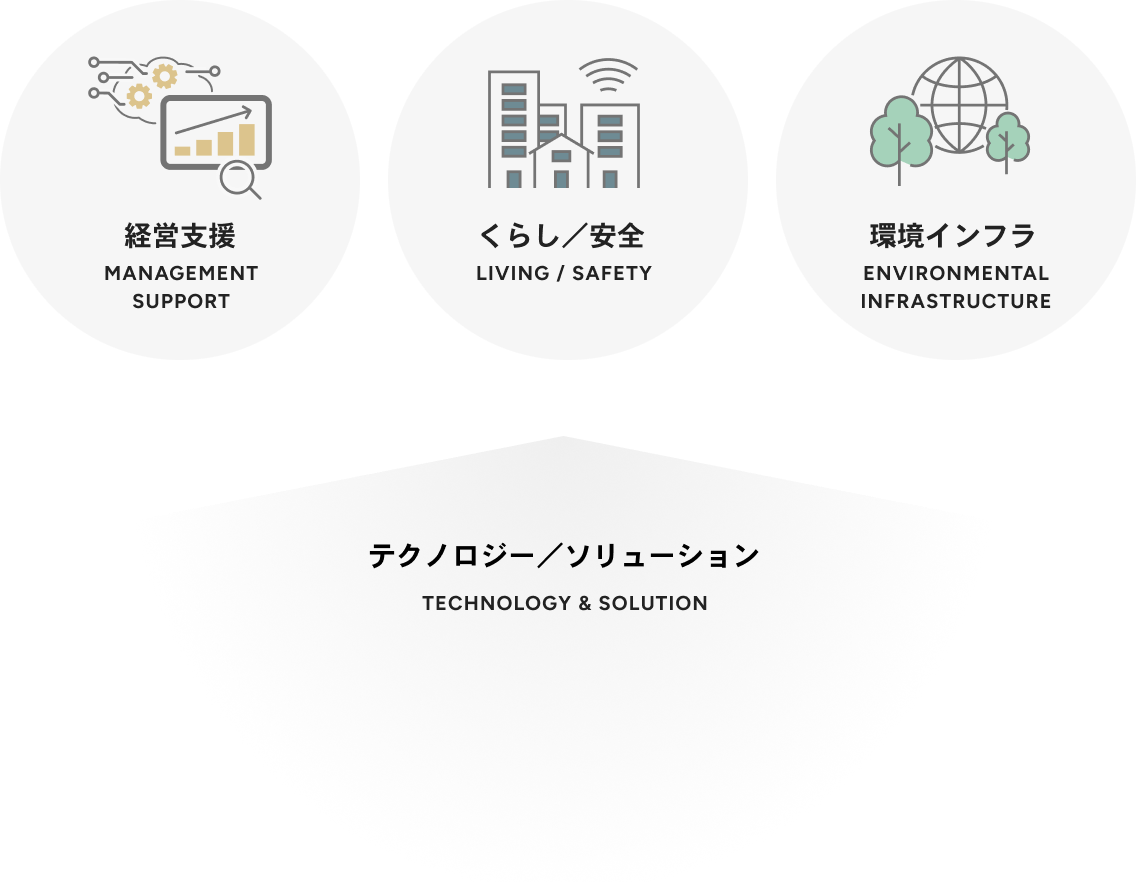 「経営支援」「くらし/安全」「環境インフラ」の3つの領域で事業を展開し、