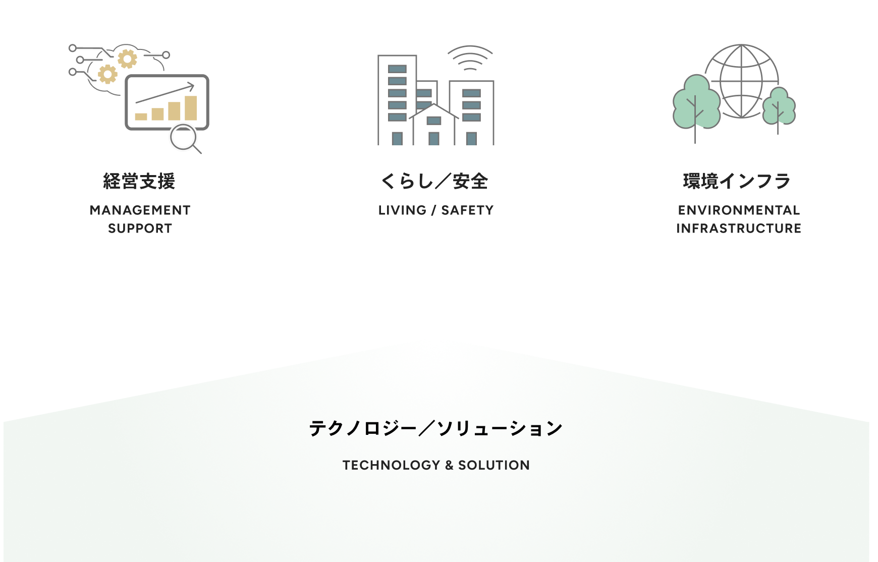 「経営支援」「くらし/安全」「環境インフラ」の3つの領域で事業を展開し、