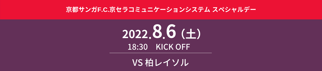 京セラコミュニケーションシステム株式会社(KCCS)は、京都サンガF.C.を応援しています。8月6日(土)にサンガスタジアム by KYOCERA で行われる、京都サンガF.C.の2022年明治安田生命J1リーグ第 24 節 柏レイソル戦(18:30キックオフ)におきまして、スポンサー特別企画「京セラコミュニケーションシステム スペシャルデー」を開催します。