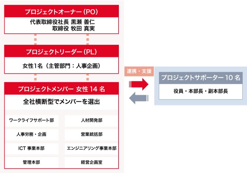 KCCSの女性活躍推進プロジェクトでは、社長の黒瀬と、女性取締役の牧田がプロジェクトオーナーを務め、社内の各部門から選出された14名の女性従業員でプロジェクトチームを構成しています。また役員や各部門の本部長・副本部長10名がプロジェクトサポーターとして参画し、プロジェクトへのアドバイスや従業員への活動内容の周知、理解促進の面で支援を行うことになりました。