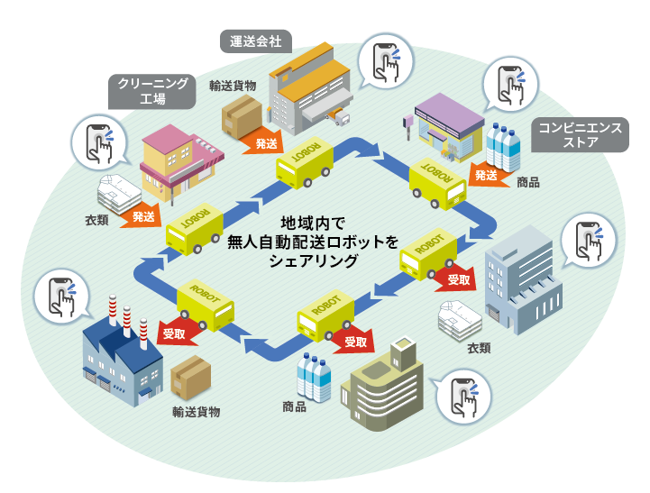 1台の無人自動配送ロボットが、地域内の小売店商品や企業間輸送貨物を集荷、効率的なルートを選択・走行し、配送します。ロボットへの荷物の預け入れ、荷物の受け取り、ロッカーの開閉などはスマートフォンで管理します。 ![]() |