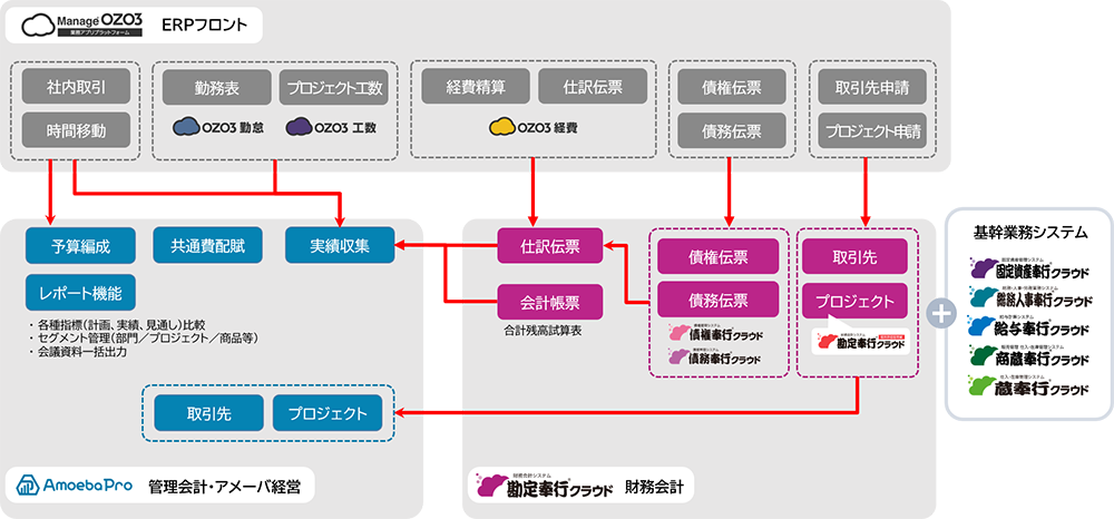 ERPフロントシステム「Manage OZO3」で日々の入力した伝票データが、財務会計システムの「勘定奉行クラウド」、管理会計システムの「Amoeba Pro」へリアルタイムに実績連携(管財一致)され、ダッシュボードから経営状況を把握できるようになります。社員の勤務時間の情報やプロジェクト別の工数情報の管理も可能です。