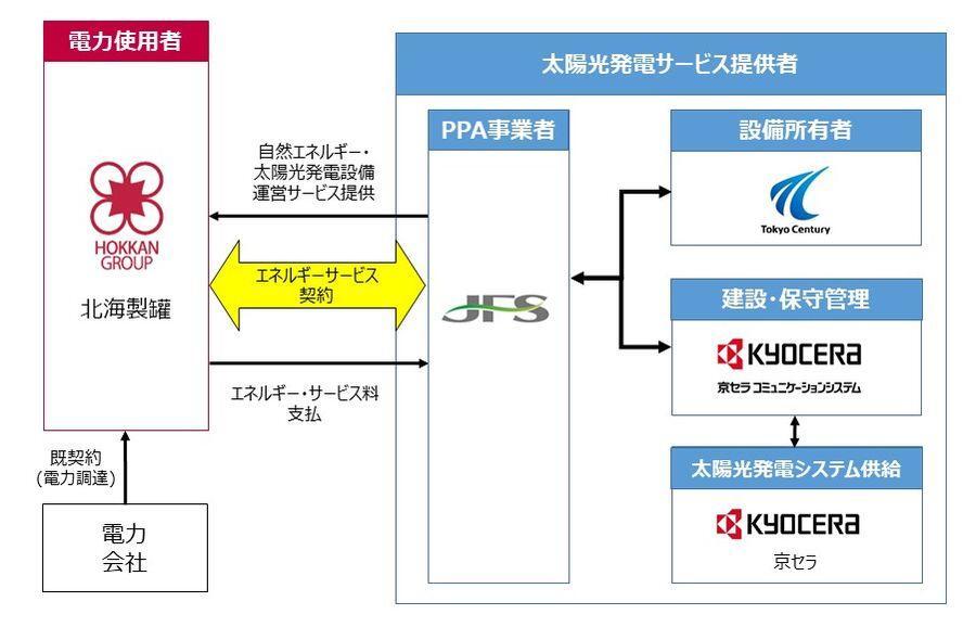 ホッカンホールディングス株式会社(本社:東京都千代田区、以下「ホッカンホールディングス」)の子会社である北海製罐株式会社(本社:東京都千代田区、以下「北海製罐」)は、日本ファシリティ・ソリューション株式会社(本社:東京都品川区、以下「JFS」)、東京センチュリー株式会社(本社:東京都千代田区、以下「東京センチュリー」)、京セラ株式会社(本社:京都府京都市、以下「京セラ」)、京セラコミュニケーションシステム株式会社(本社:京都府京都市、以下「KCCS」)の4社と協力して、オンサイトPPA(※)モデルであるエネルギーサービスの取り組みを開始しますので下記のとおり、お知らせいたします。