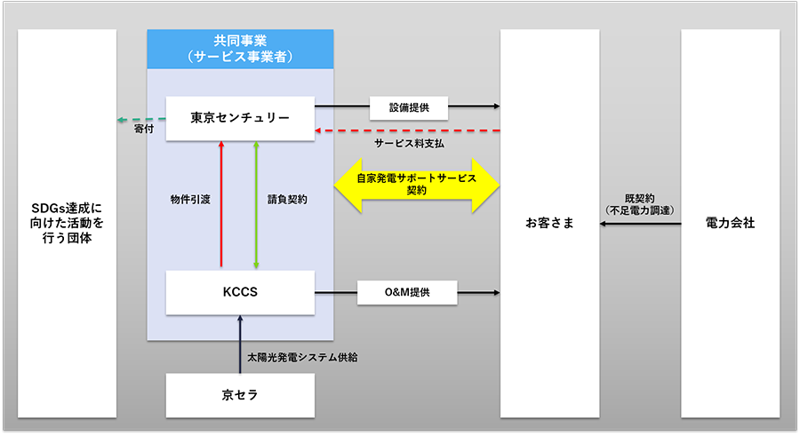 東京センチュリー株式会社(本社:東京都千代田区、代表取締役社長:馬場 高一、以下「東京センチュリー」)と京セラ株式会社(本社:京都府京都市、代表取締役社長:谷本 秀夫、以下「京セラ」)、京セラコミュニケーションシステム株式会社(本社:京都府京都市、代表取締役社長:黒瀬 善仁、以下「KCCS」)は、SDGs(持続可能な開発目標)の達成に資する新たな取り組みとして、寄付型のコーポレートPPA(自家発電サポートサービス)の提供を開始いたしましたので、下記のとおり、お知らせします。