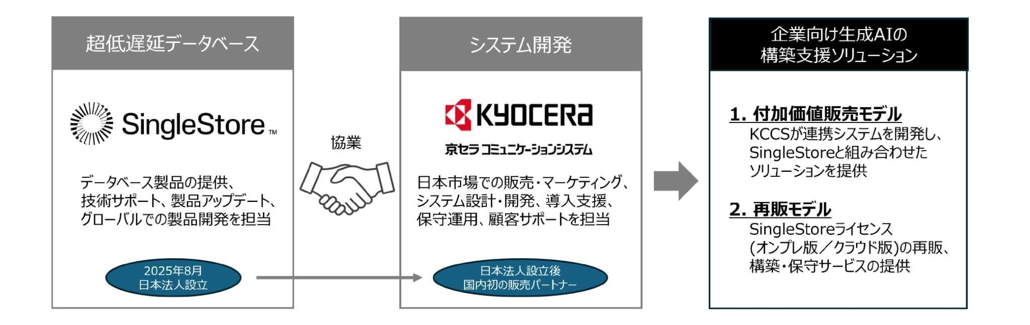 京セラコミュニケーションシステム株式会社(本社:京都市伏見区 代表取締役社長 河之口 達也、以下KCCS)と超低遅延AI対応の分散型データベースを提供するSingleStore, Inc.(本社:米国、最高経営責任者(CEO) ラジ・ヴェルマ、以下SingleStore)は協業契約を締結し、リアルタイムな意思決定や企業向け生成AIの構築支援ソリューションを2025年10月23日から提供開始します。