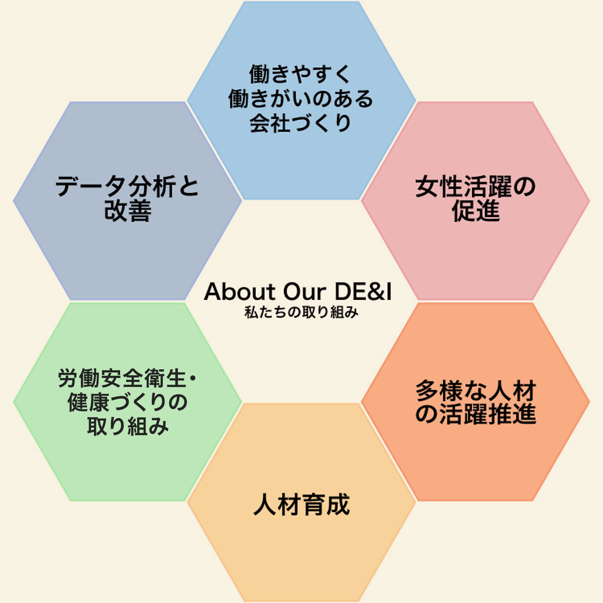 DE&I推進の第一歩として、現在、女性従業員の活躍促進に着手しています。自社の課題を分析した上で、トップマネジメントがオーナーを務める社内横断プロジェクトを立ち上げ、改善に取り組んでおり、2024年には「えるぼし認定」最高位の3つ星と「くるみん認定」を、2025年には「プラチナえるぼし認定」を取得しました。